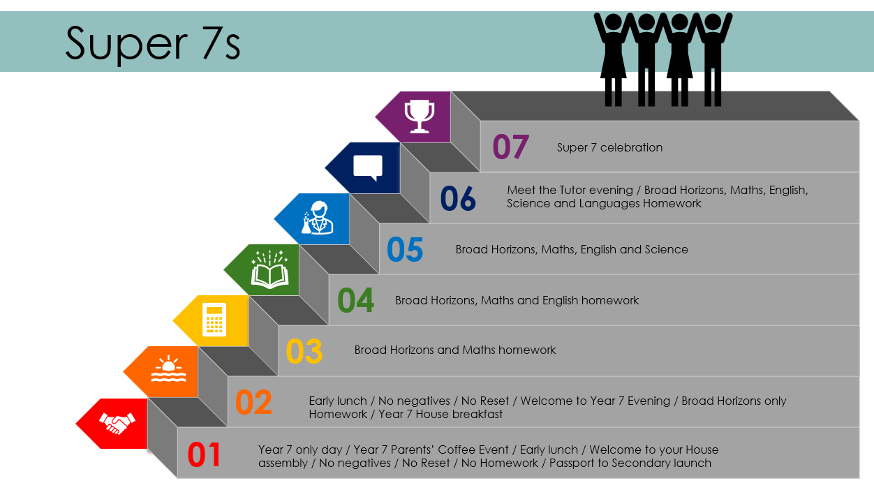 Your child will receive a Super 7s “Passport to Secondary”, a dedicated transition tool designed to help them feel confident, involved and excited about joining us. We also offer a range of supportive activities—such as coffee mornings, tie ceremonies, early lunches and our Welcome to Year 7 Evening—all of which help students (and families!) settle smoothly into secondary school life and feel part of our community from day one.